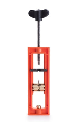 Advancement screw (7) whose upper part comes with an ergonomic plastic knob (8), while the lower part is designed to couple perfectly with the tool's bevel, to reduce friction and to allow the press to operate perpendicularly without play. How to press a pinion.