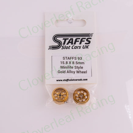 Staffs 93 15.8 x 8.5mm Minilite Aluminum Wheels, GOLD for 3/32" axles. These wheels feature a hubless design and use M2 set screws (included). You will need a 0.9mm hex driver (not included) to loosen / tighten the set screws.