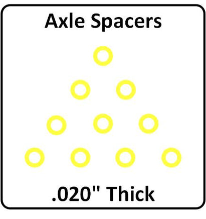 Experienced slot car builders and racers know the importance of axle spacers - they are very helpful when adjusting front and rear track width and allow precise adjustment of gear mesh. Our thinnest spacers allow precise adjustments - for example, when removing side-to-side "slop" in the rear axle assembly. The spacers can also be "stacked" to fill larger gaps - for example, when adjusting the front track width or when centering a crown gear on the motor shaft.