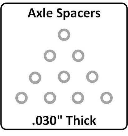 Experienced slot car builders and racers know the importance of axle spacers - they are very helpful when adjusting front and rear track width and allow precise adjustment of gear mesh. Our thinnest spacers allow precise adjustments - for example, when removing side-to-side "slop" in the rear axle assembly. The spacers can also be "stacked" to fill larger gaps - for example, when adjusting the front track width or when centering a crown gear on the motor shaft.