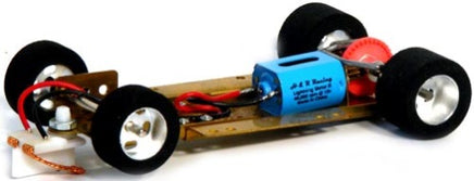 H&R Racing Products Adjustable Wheelbase 1/24 RTR assembled Rolling Chassis - Wheelbase adjustable from 3 5/8" to 4 7/8" (92mm to 123mm) - Includes new 40,000 RPM Motor with larger cooling holes, FISH RUBBER rear foam tires on setscrew aluminum hubs, Oilite bushings, body mounting kit - Comes with inline motor mount & Parma axle gearing - recommended for commercial routed track racing & NASCAR type or similar 1/24 or 1/25 vacuum formed or hard plastic model bodies