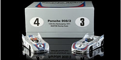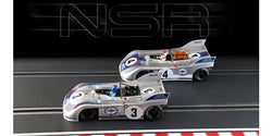 NSR SET10 - Porsche 908/3 #3 WINNER + #4 3RD MARTINI RACING NURGURGRING 1971 - Limited Edition (500 pcs, Only !) - Setscrew Aluminum wheels all around - Sidewinder Balanced Shark EVO Motor 21.5 - 21,900 RPM - Adjustable suspension motor pod - Heat treated axles - Machined bronze self lubricating bushings - Adjustable front axle ride height - Ultra smooth and quiet all metal gearing - Clear Coat Finish for maximum durability and high gloss