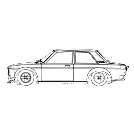 RevoSlot RS0204 Datsun 510 White Kit. This 1:32 analog slot car features a 2-piece aluminum chassis with high-quality components throughout.