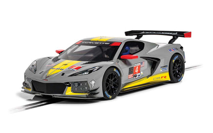 Scalextric C4240 Chevrolet Corvette C8R No. 4. This car raced in the 2020 24 Hours of Daytona. Drivers: Fassler, Gavin, and Milner. This 1:32 slot car is compatible with analog track systems out-of-the-box. Optional digital chip is available for purchase separately.