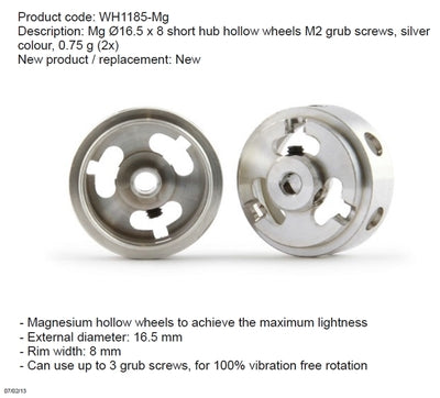 SIWH1185-MG Slot.it Light Weight Magnesium "Short Hub" 16.5mm tall x 8mm wide M2 setscrew - set of 2 pcs. - natural silver color - includes machined balancing feature to offset setscrew weight - does not include wheel inserts - This is the NEW lightest version of the versatile, magnesium wheel - Can use up to 3 grub screws, for 100% vibration free rotation.