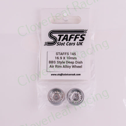 Staffs 145 16.9 x 10mm BBS Deep Dish Aluminum Wheels, SILVER for 3/32" axles. These wheels feature an external hub design, dual ribs, and use M2 set screws (included). The dual rib design lets you run tire with an air gap or tires that fill the gap between the ribs. You will need a 0.9mm hex driver (not included) to loosen / tighten the set screws.