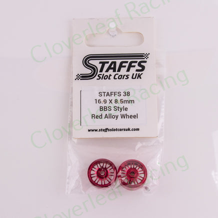 Staffs 38 16.9 x 8.5mm BBS Aluminum Wheels, RED for 3/32" axles. These wheels feature a hubless design and use M2 set screws (included). You will need a 0.9mm hex driver (not included) to loosen / tighten the set screws.