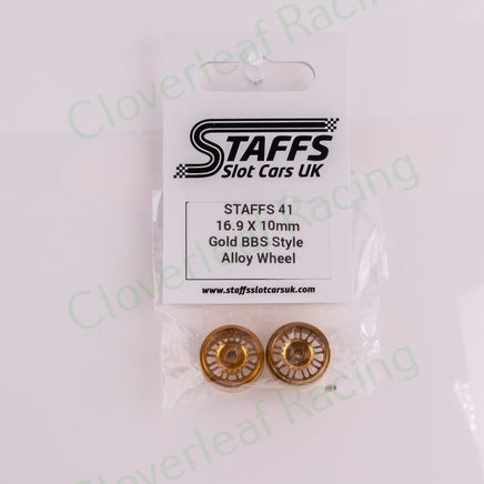 Staffs 41 16.9 x 10mm BBS Aluminum Wheels, GOLD for 3/32" axles. These wheels feature a hubless design and use M2 set screws (included). You will need a 0.9mm hex driver (not included) to loosen / tighten the set screws.