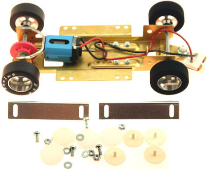 H&R Racing Products Adjustable Wheelbase 1/24 RTR assembled Rolling Chassis - Wheelbase adjustable from 3 5/8" to 4 7/8" (92mm to 123mm) - Includes 26,000 RPM small can Cobra motor, narrow Soft SILICONE rear tires (Shore A 25 Hardness) on setscrew aluminum hubs and foam fronts, Oilite bushings, body mounting kit - Comes with inline motor mount & Parma axle gearing - recommended for plastic home track application or commercial routed track racing where no glue is used