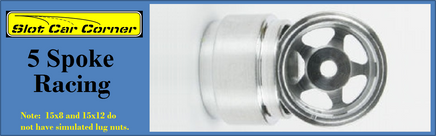 C.B. Design 5-Spoke Racing Wheels 15.8 x 8.5mm (Silver) are high-performance CNC machined aluminum wheels designed for a variety of 1:32 slot car applications.  Similar in appearance to the C.B. Design 5-Spoke Classic Wheels but lighter weight.  For best performance, we recommend: