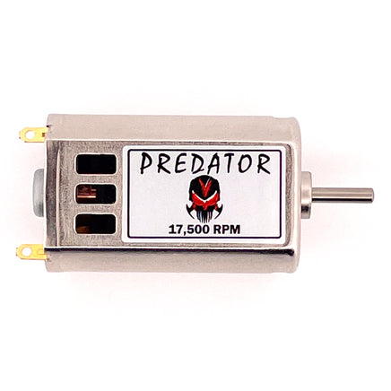 Predator Slot Car Motor featuring long can motor (FK-180) - rated at 17,500 RPM, 250 g-cm torque at 12VDC. Motor shaft OD is 2.0mm. Features include:
