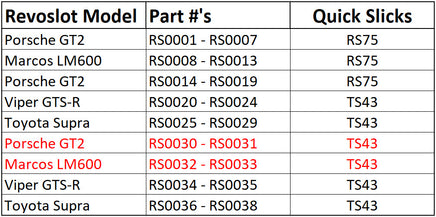 Description Quick Slicks are available in several high-performance silicone compounds for different combinations of track configuration, track surface, track power level, car/motor type, chassis setup, driving style and race strategy. Unlike our competitors' who only offer a single silicone compound, Quick Slicks gives you more tuning options by letting YOU decide which compound best meets your requirements. The Quick Slicks shown on this page are FIRM compound silicone tires. This simply means they have a higher Shore A rating than our soft and firm Quick Slicks compounds. Like all Quick Slicks, gluing and truing is NOT required. However, more serious racers will often glue/true their tires to improve tire performance and overall handling. tires, firm compound silicone tires are available for many popular 1:32 cars and wheels. tires, firm compound tires are also available for several 1:24 cars. Look for more Quick Slicks applications in the future. Not Sure Which Quick Slicks You Need? We've made finding the right Quick Slicks easy - just click on our exclusive Quick Slicks Tire Selector. Note: All trademarks are property of their respective owner.