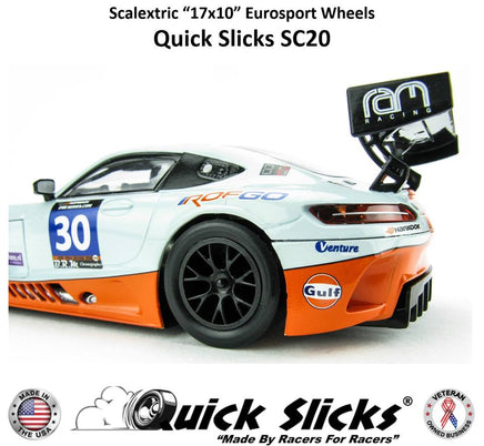 Quick Slicks SC20 tires are designed specifically for the Scalextric Mercedes AMG GT3 and Porsche 911 RSR (stock) wheels.